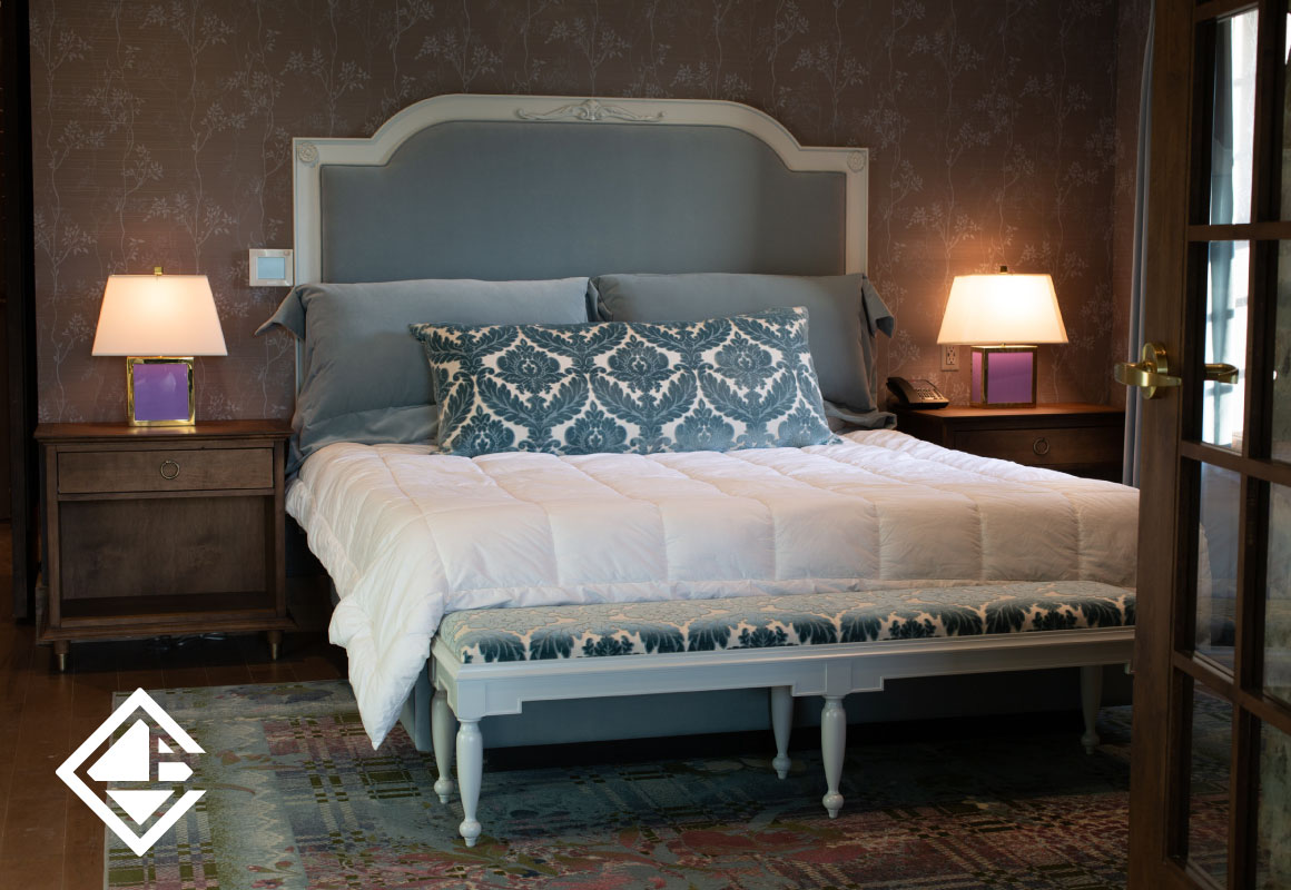 Picture yourself curled up with a good book, the wood fire flickering in the background, and before you know it, you’ve travelled back in time. The bed is cozy, the headboard plush, the pillows plump, the colours muted and serene. This is where the cares of today melt away, and only luxurious comfort remains. When it’s time to leave, a cushioned bench at the foot of the bed makes the transition to reality much easier.