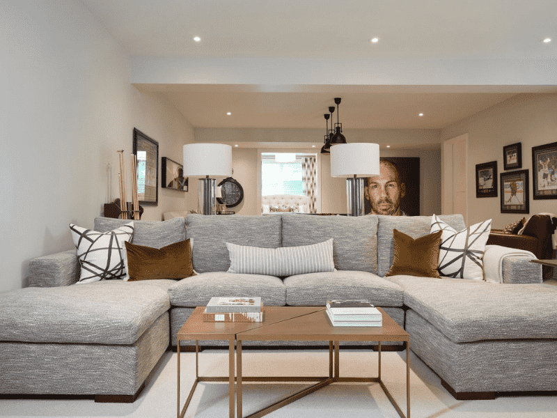 We love how the neutrals in this space allow for the freedom of modern styling. Gold and bronze accents create a luxurious feel in the entire living room. Our Broadway sectional is the main focal point of this room, paired with luxury-designed throw pillows. The neutral fabric creates a cozy, relaxing vibe, making you feel like it is the ultimate place to unwind from your day.