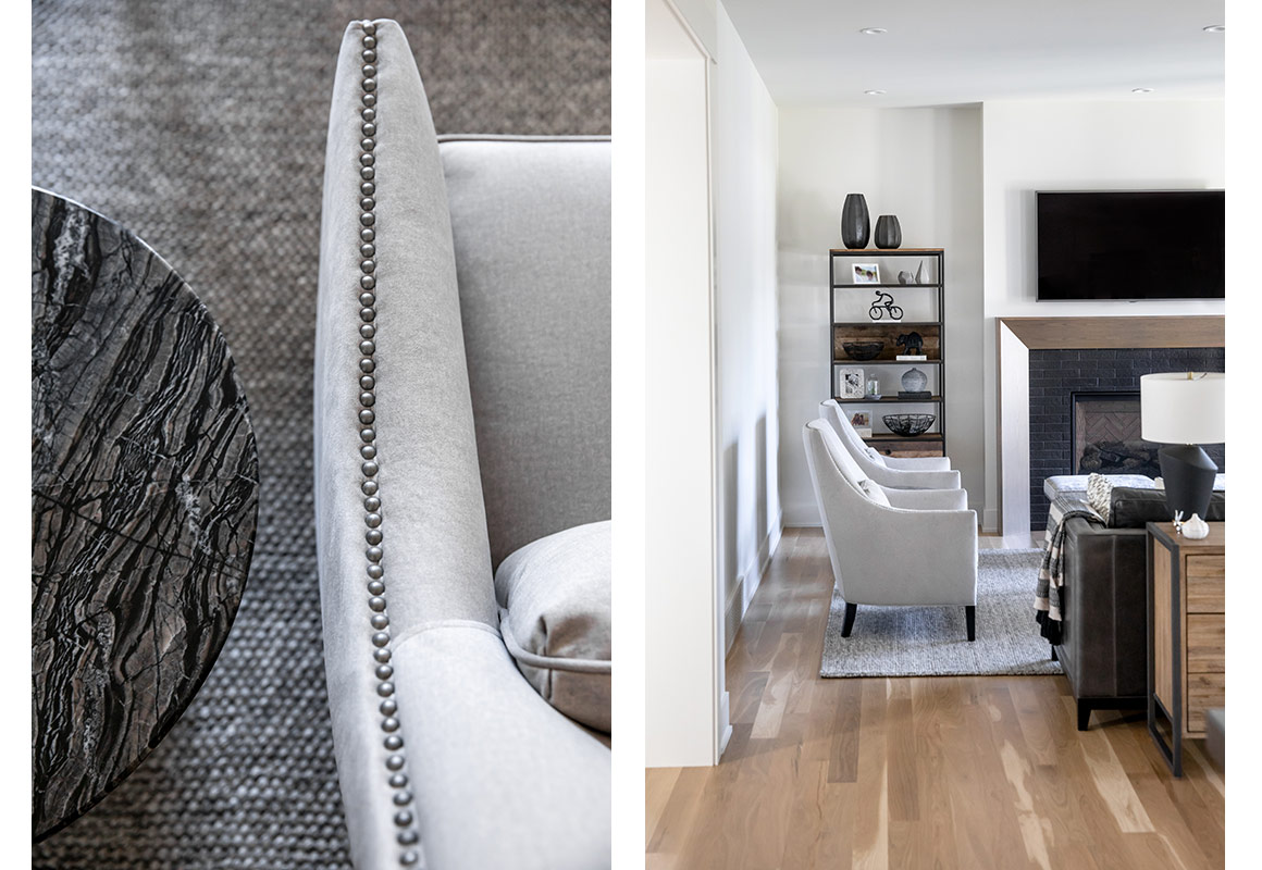 The sophisticated but oh-so-comfortable 11870 Lounge Chairs in this room tie together the light and dark hues that make up this bright and cozy space. A silvery fabric is offset by pewter nail head trim and dark wooden legs to accentuate the details and the beautiful flow of the chair’s design. The rest of the room is a balance of dark wooden finishes and light grey accent decor, all coming together to create an airy, inviting, refreshing, warm space.