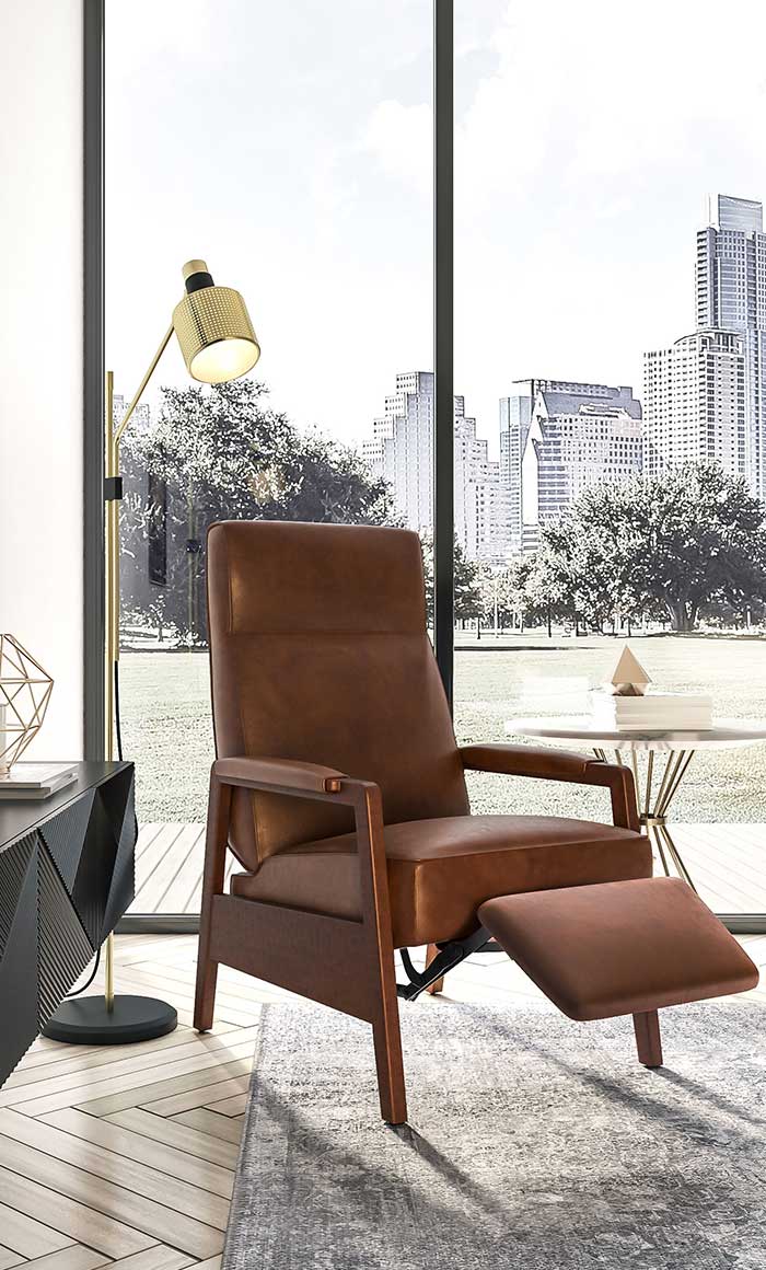 Just beyond the clutches of metropolitan life, this ultra-modern, window-clad urban retreat is the perfect place to kick back in peace after a long day at the office. Gold elements accent this sleek and spacious sitting room beautifully, and a floating side table keeps the room airy, even with its dramatic black finish. Sleek and handsome but finished in rugged leather and rich walnut, the recliner is executive-worthy – a dignified and streamlined alternative to a traditional armchair. Surrounded by tasteful neutrals and refreshing greenery, sitting in this room will surely prompt a sigh of relief.