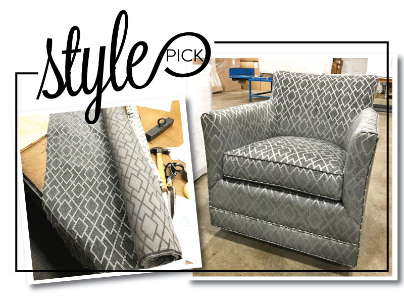 This week’s style pick by Sharyl features our 17560 Swivel Glider chair showcasing the elegant “Diamond” fabric pattern from J. Ennis Fabrics. Note how the generously crowned seat cushion balances with the tailored upholstery. We have fallen in love with this chair!